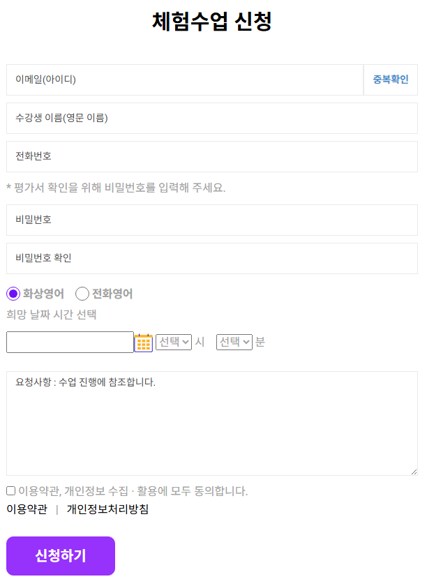 홈페이지에 전화번호, 이름, 희망 날짜, 시간과 본인이 생각하는 영어레벨을 남겨주세요.